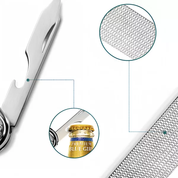 Save space by carrying one item that serves multiple needs. Switch quickly between file, opener, knife, screw tool, scissors, and nail clippers.