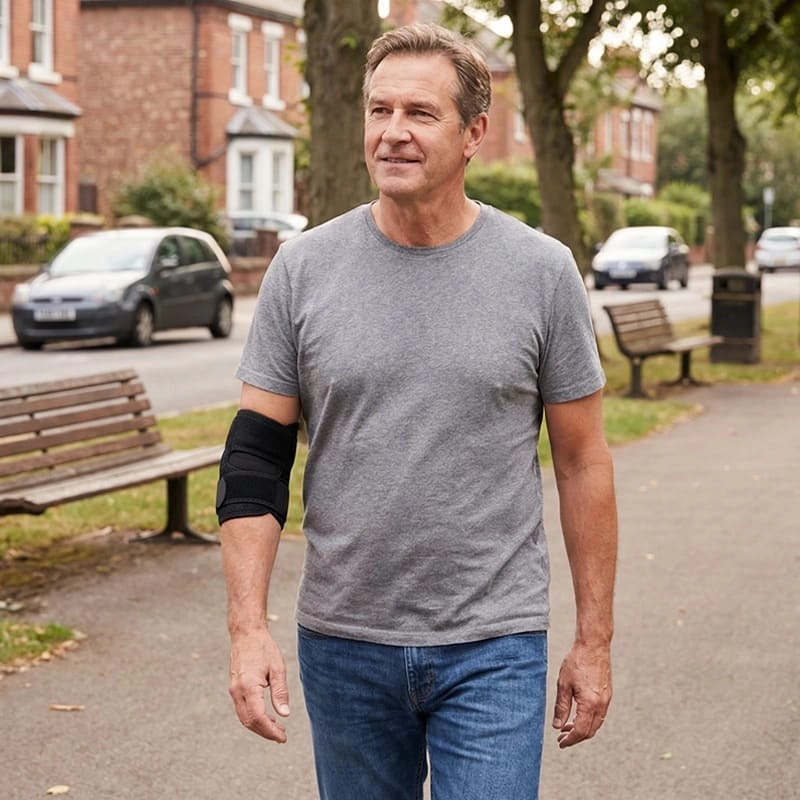 I like that I can adjust it easily. It stays put while I garden or walk my dog, and my elbow feels great.