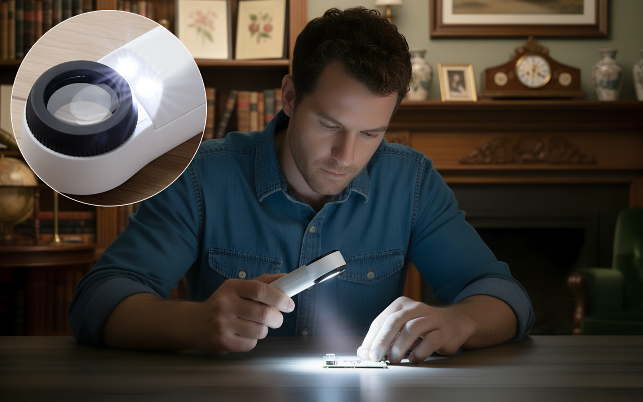 I use this glass to inspect old coins from my dad. The strong magnification and lights let me see year stamps and tiny marks I never noticed before.