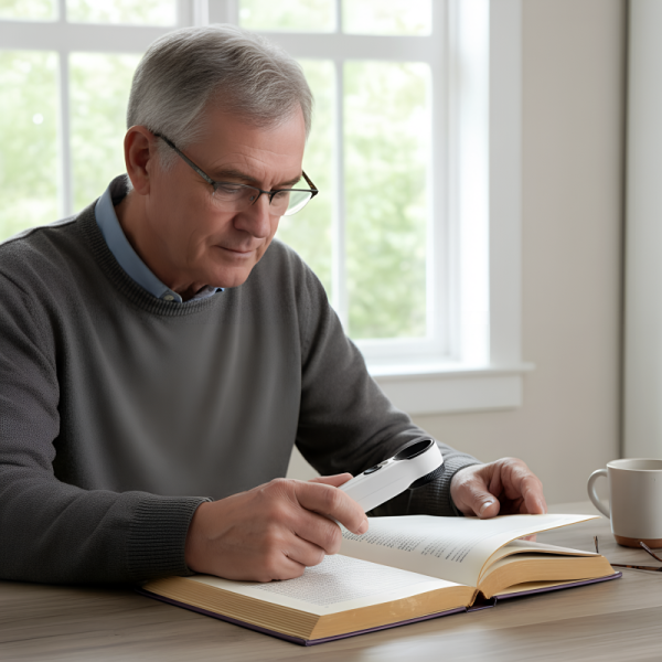I keep this magnifying glass by the sofa for crosswords and sewing. The handle feels comfy, and the LEDs help a lot in the evening.