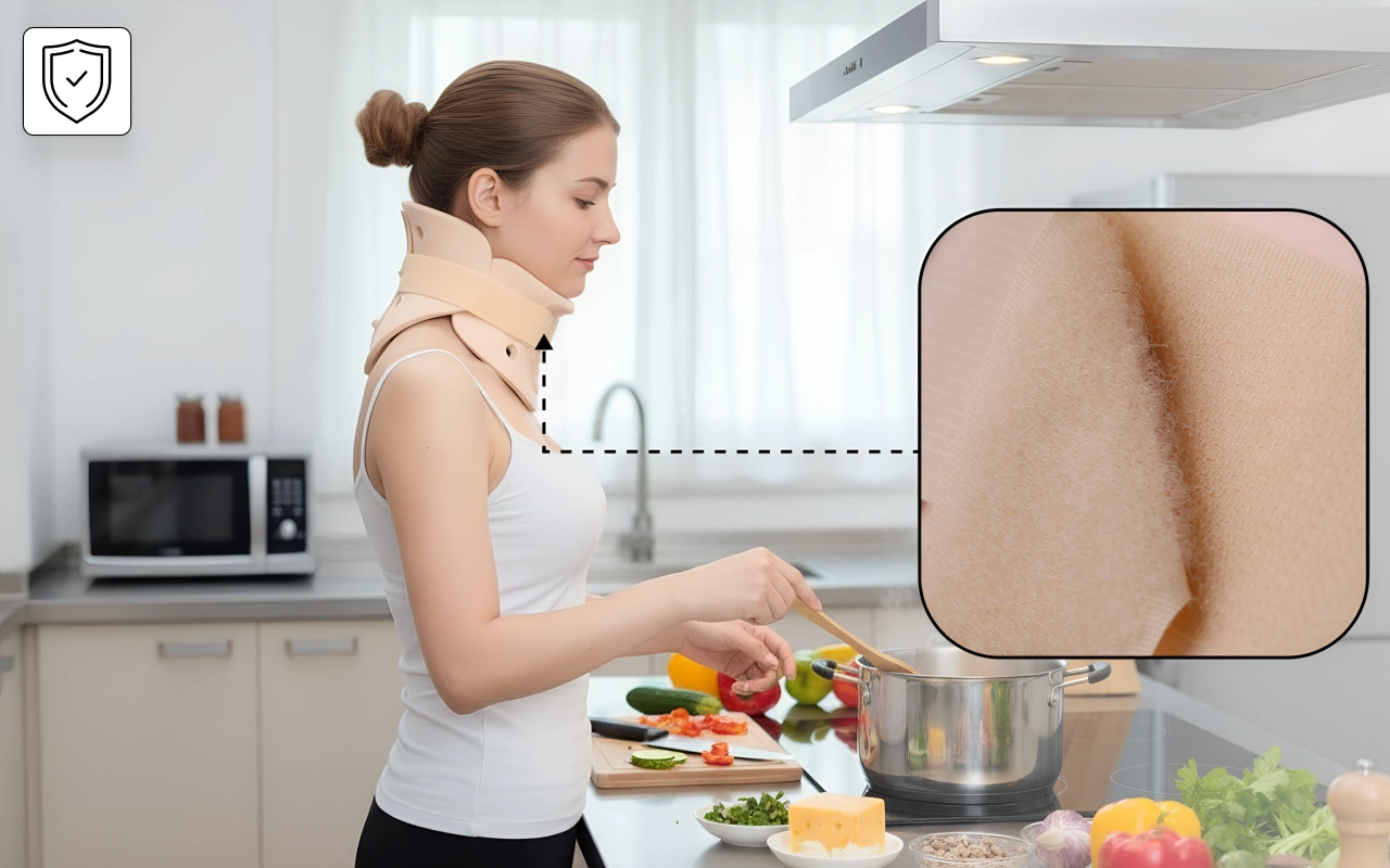 Using this soft collar after a muscle strain made daily chores easier. I like the steady support and that the fabric doesn’t trap heat around my neck.