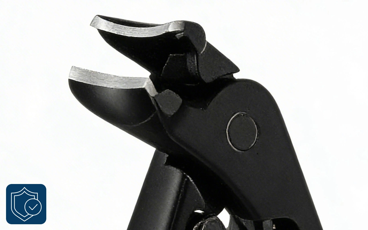 Stainless steel jaws grip firmly for clean cuts. The curved tip reaches corners other tools cannot touch.