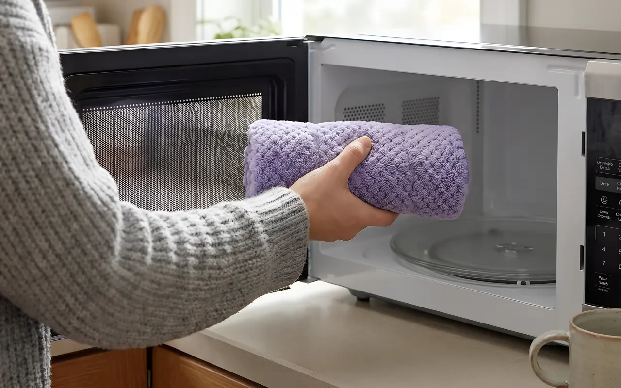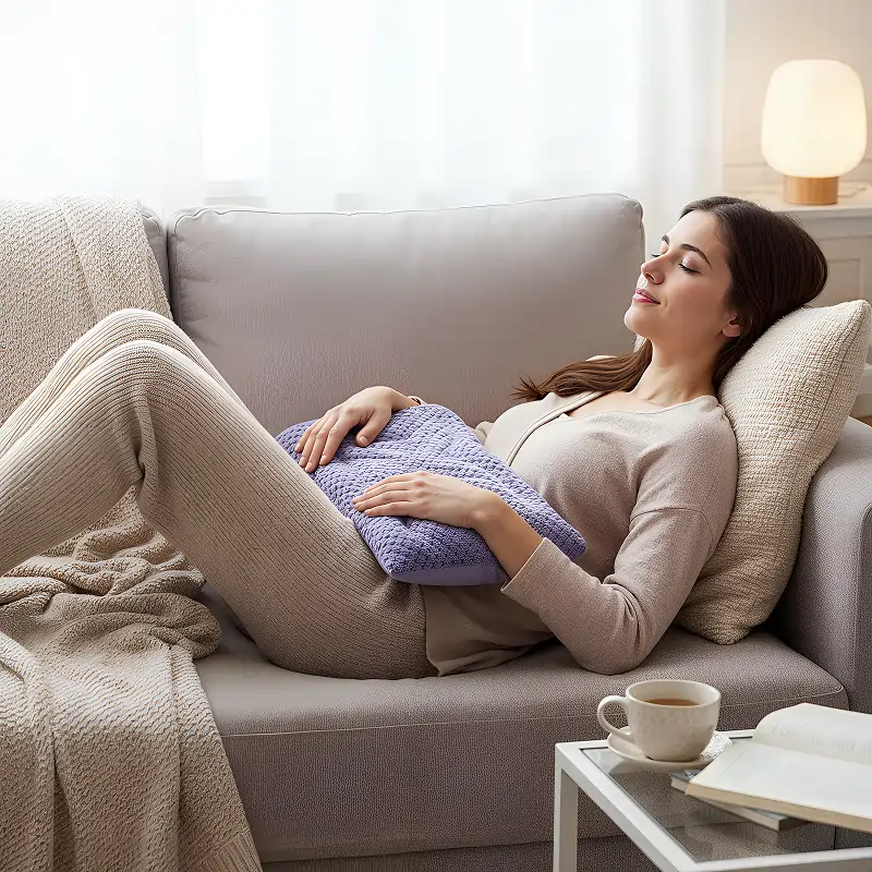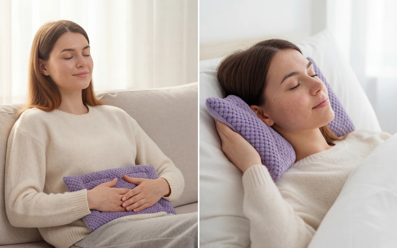 This soft fleece wrap is my go‑to on cold evenings. I warm it up, drape it over my stomach, and it eases cramps and helps me relax.
