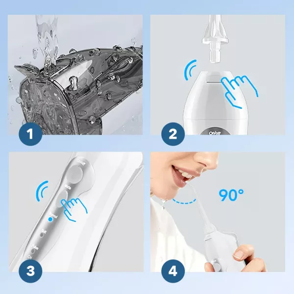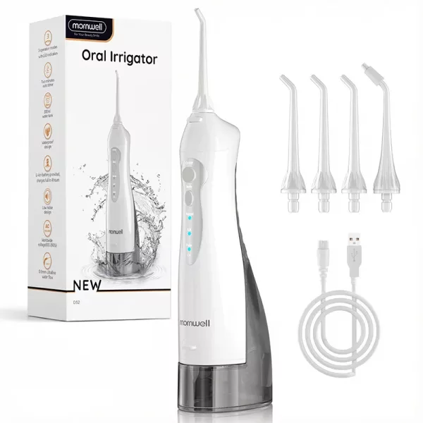 Our irrigator includes three nozzles for regular cleaning and a tongue scraper.