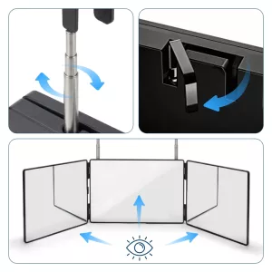 Ortorex trifold mirror quickly and easily solves daily grooming struggles. Adjust the height for full visibility while styling or shaving. Fold it flat to fit in bags and drawers for travel. Find clear reflections for haircuts, make-up, or skincare every day.