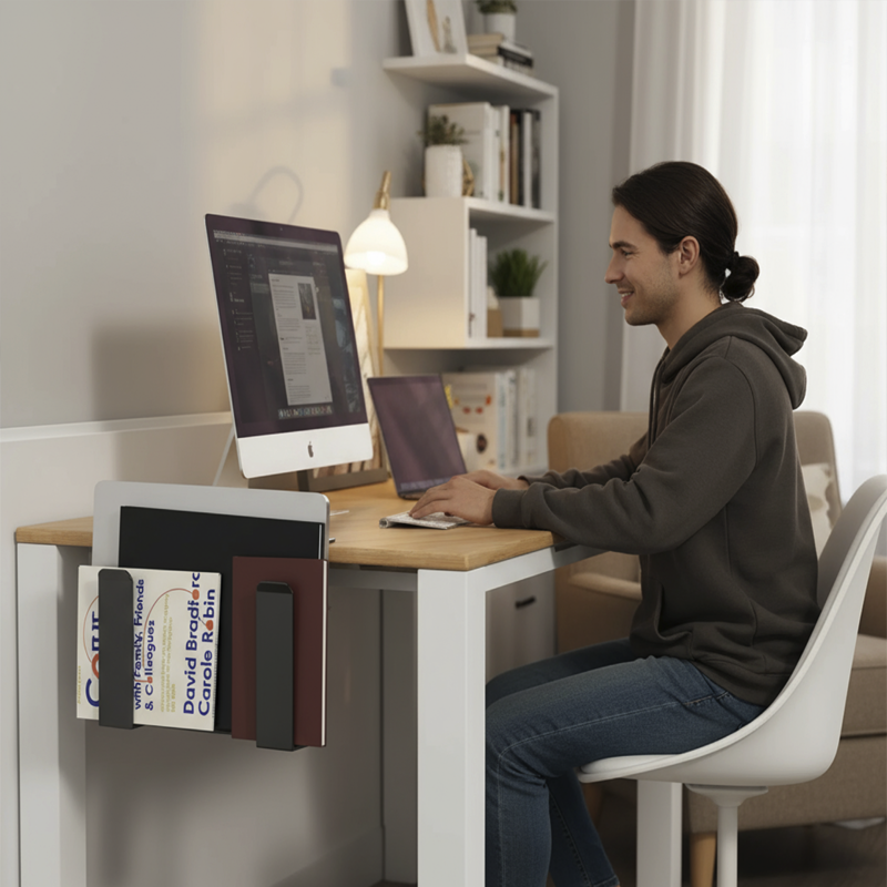 Reduce clutter fast using a smart holder beside your desk. Enjoy more room for working, typing or writing without distractions.