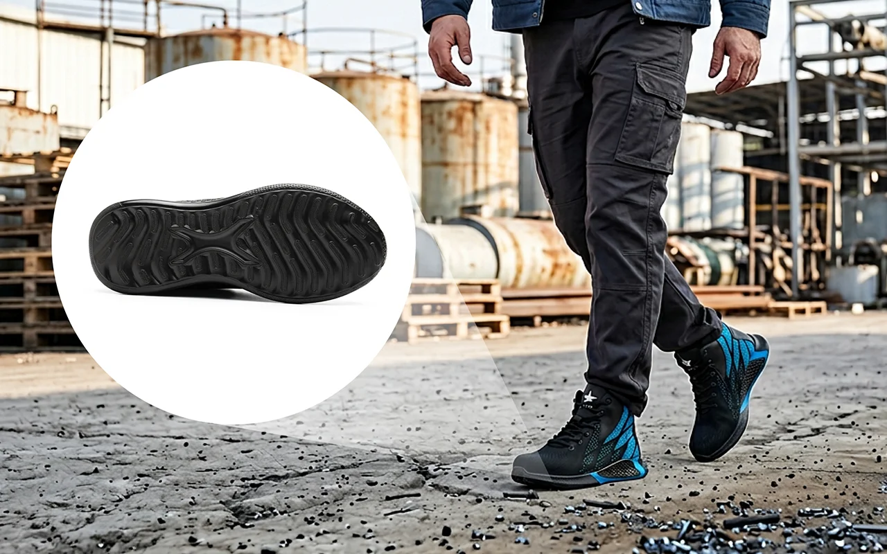 Ortorex sneakers use patterned soles that grip wet, oily workshop floors. Reliable footing reduces dangerous slips, helping workers move faster and more confidently.