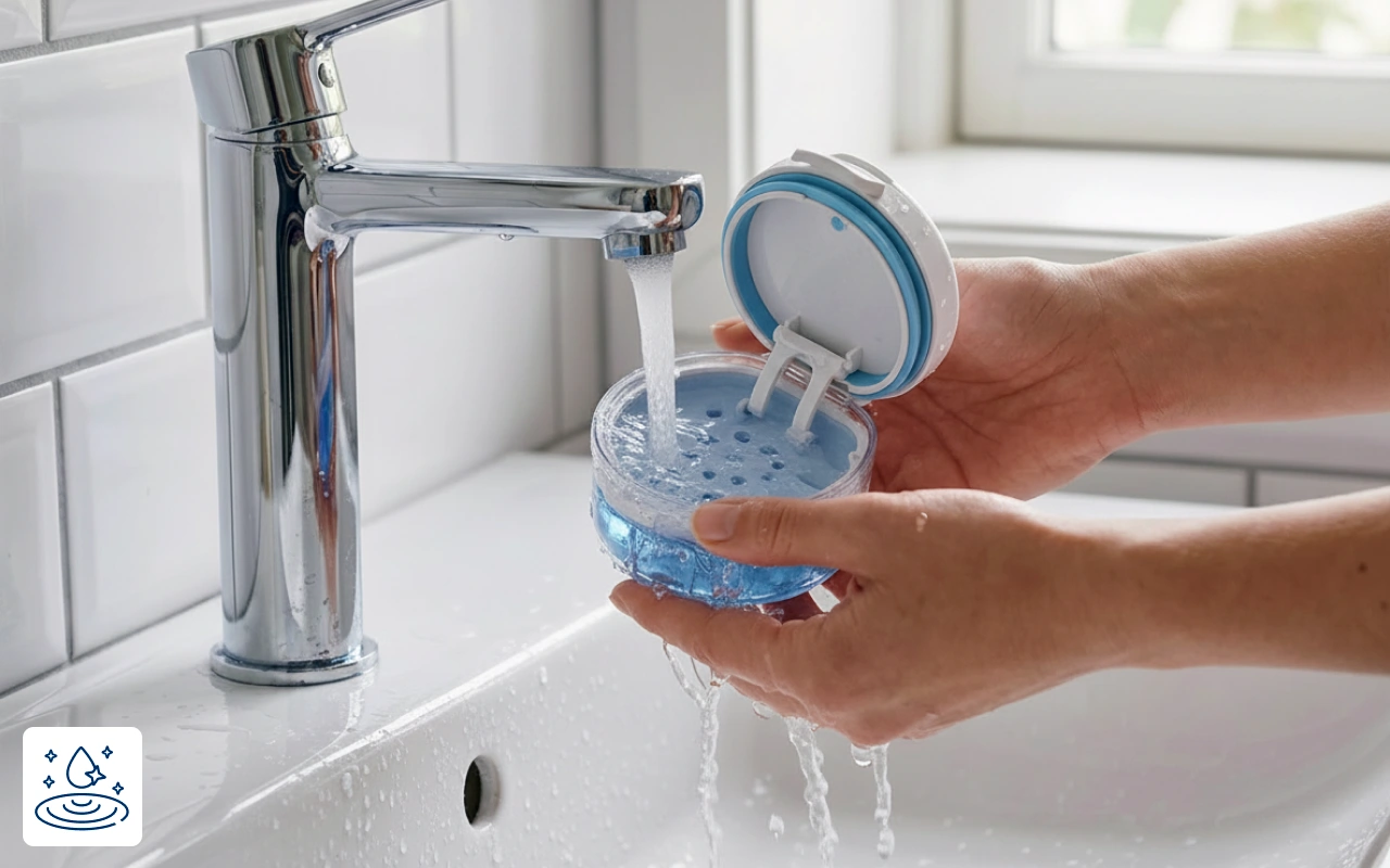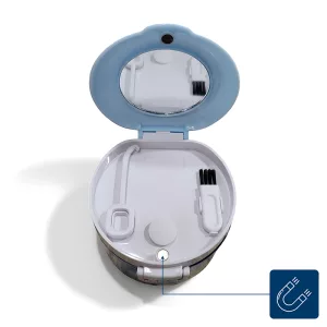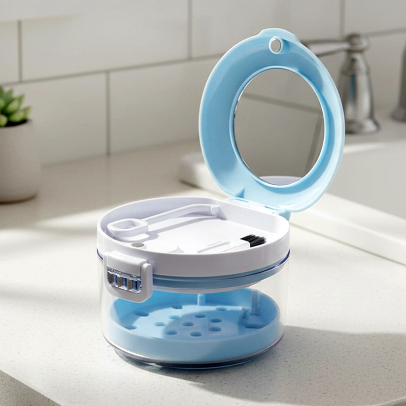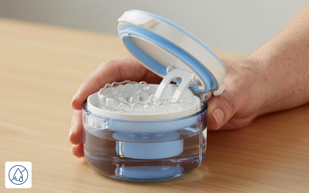 I wear a retainer full time and this tiny container lives in my work bag. It stays shut, no spills, and rinses clean in seconds.