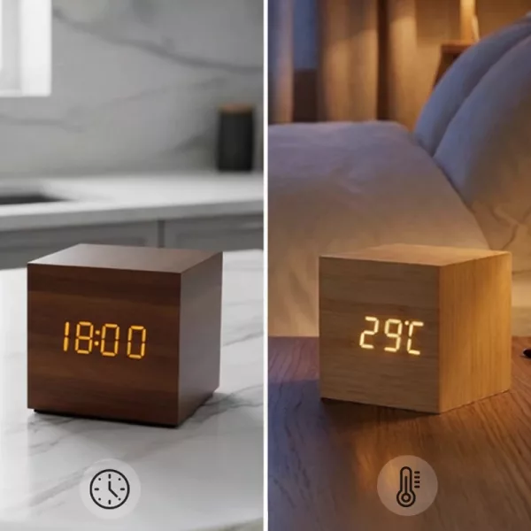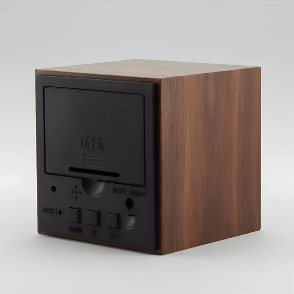 The wood cube feels nice and modern. I keep checking the temperature so I can pick what to wear. Works really well!